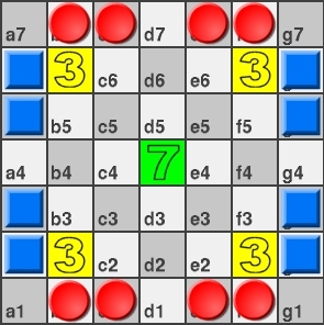 different sized board (7x7), fewer pieces (8), a different starting